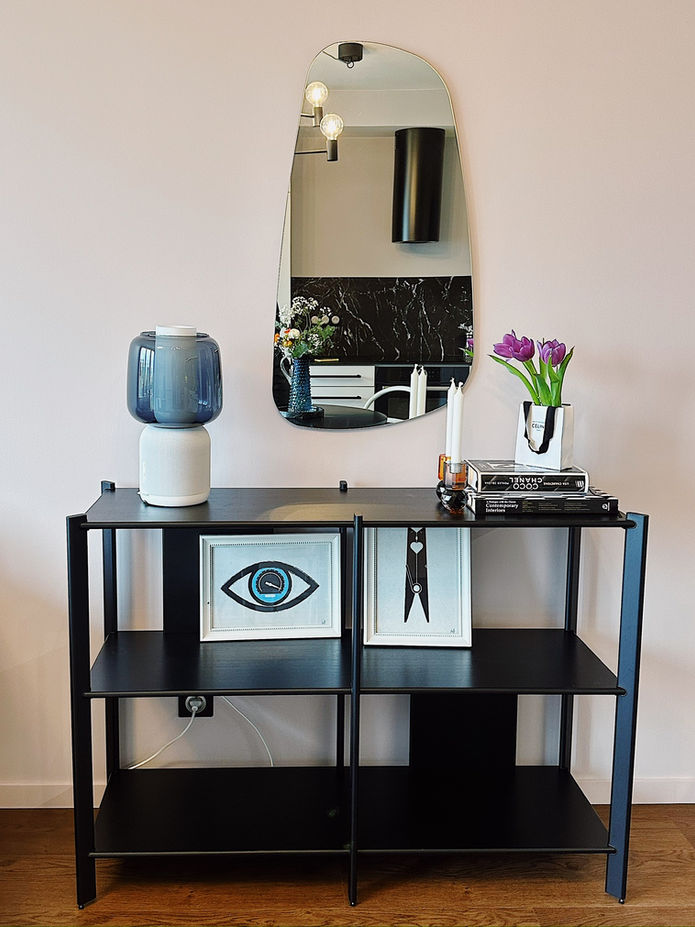 Elegantní interiér, kde se snoubí moderní design s praktičností. Čisté linie, kontrastní barvy a chytré uspořádání tvoří útulný a zároveň stylový prostor. Každý detail – od výrazného mramorového obkladu až po sametově modrou pohovku – je promyšlen s citem pro estetiku i funkci. Bydlení, které má charakter i pohodlí.